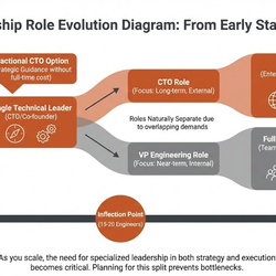 Stage 1 (0–15 engineers): You need technology strategy and architecture guidance. You don't need someone managing a team of two. A fractional CTO is the right answer here. They set the technical direction, make the foundational decisions, and help you hire well. They cost a fraction of a full-time hire and bring more relevant experience.